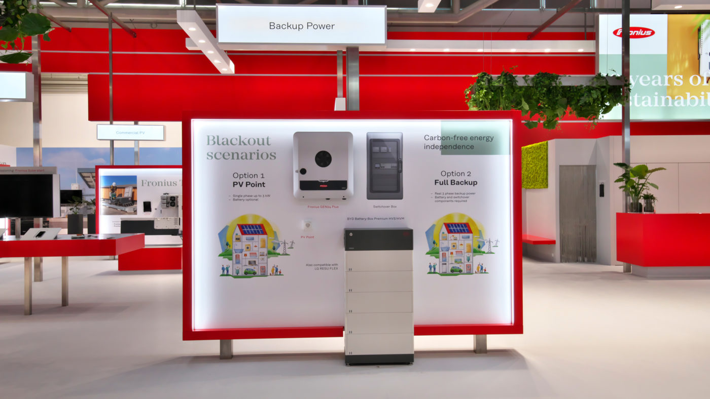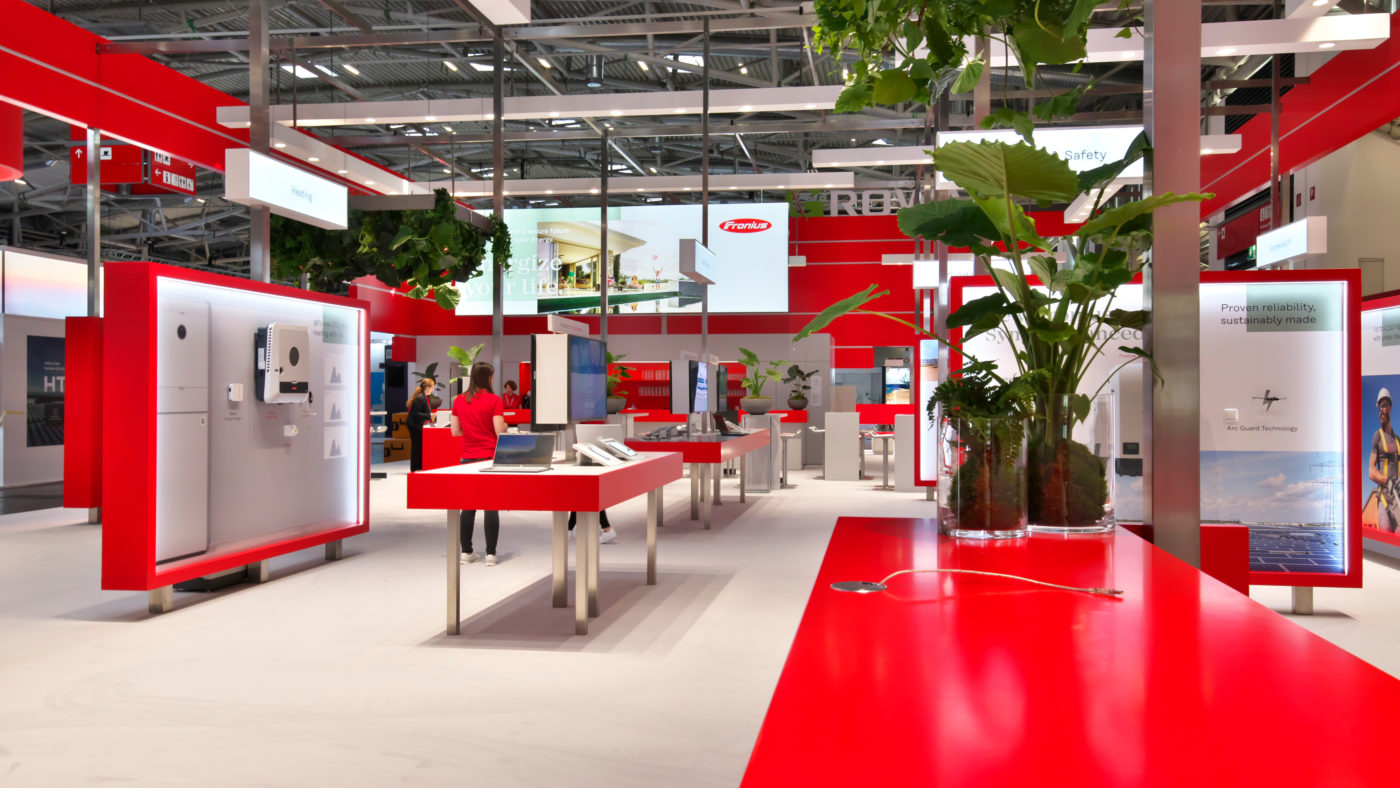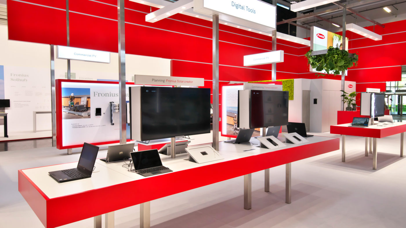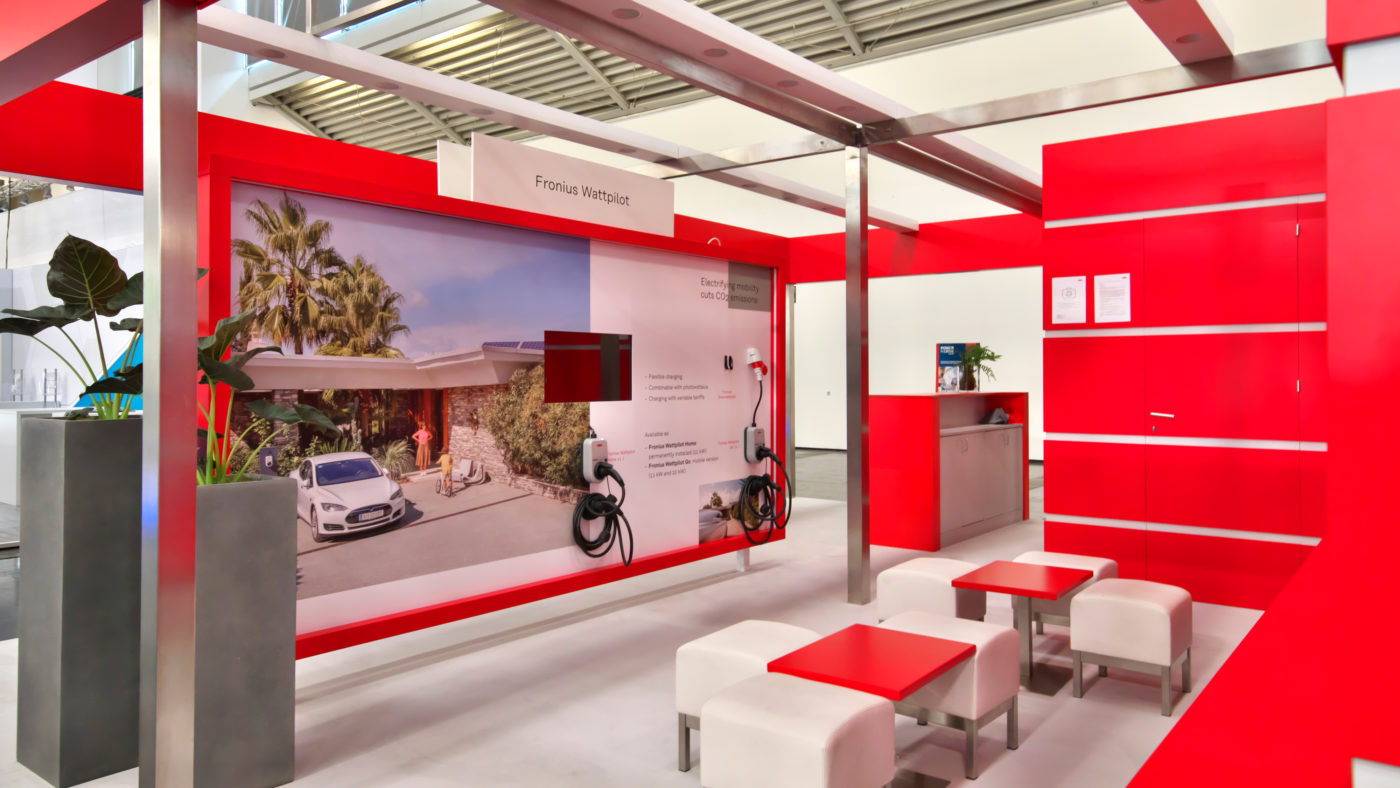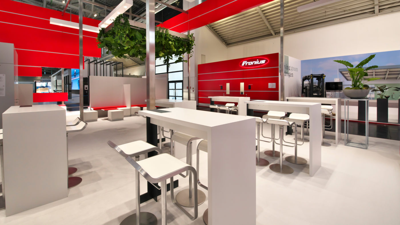 Der 670 m² große Stand ist in lackiertem MDF großzügig ausgekleidet. Grafikelemente dienen der Produkterklärung ebenso, wie als Raumteiler. Nebenstände präsentieren „Sonderausstellungen“, wie die E-Mobilität. Für Schwergewichte wie einen E-Stapler wurde ein eigens verstärkter Boden gebaut.