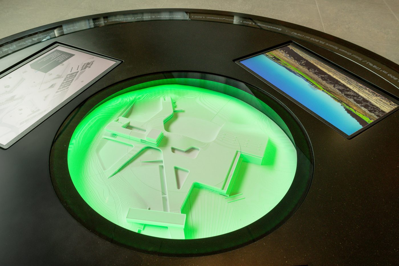 In der Umsetzung war der Anspruch die Verbindung von High Tech Elektronik und Licht in Ausstellungsmobilar mit Tischlerhandwerk zu integrieren. Interaktive Tische und LED Wände wurden vorwiegend in schwarzem MDF mit Klarlackoberfläche hergestellt. Im 4D Kino mit Teppichbezogenen Sitzstufen trifft Multimedialität auf reale Erfahrung.