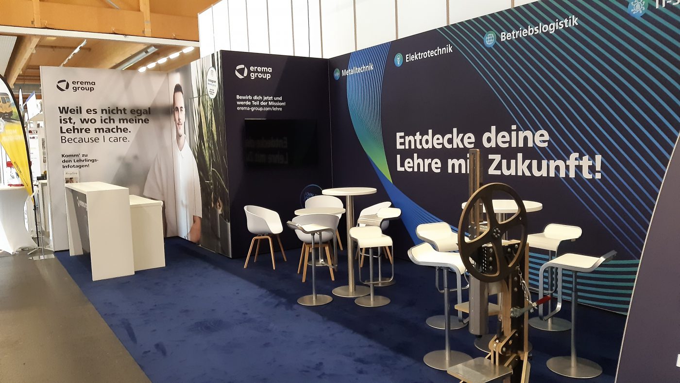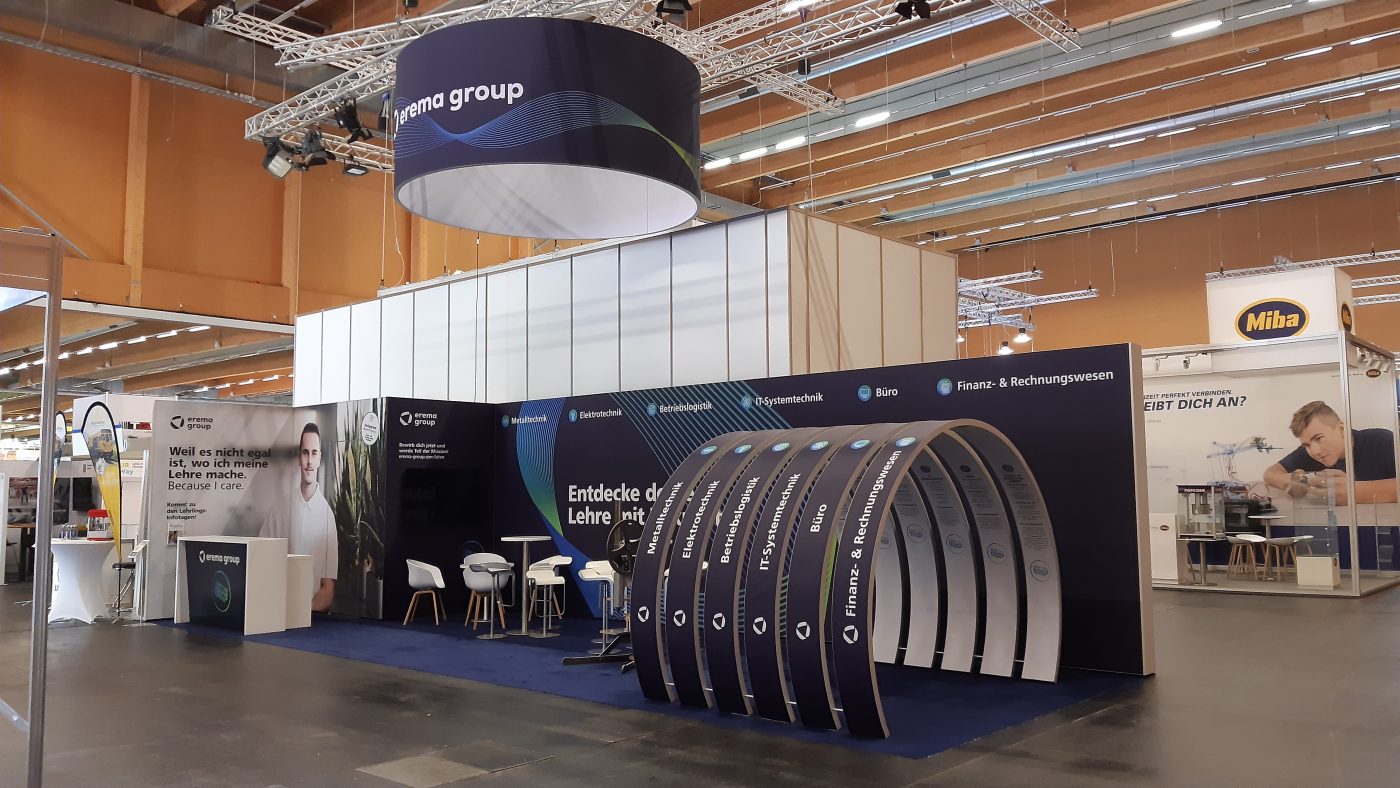Auf 48 m² mussten wir die Jugend informieren und begeistern. In sechs Bögen, die zu einem Tunnel geformt sind, sind die Berufsbilder beschrieben. Die geformten Wandelemente und Bögen sind mit Großflächenplotts beklebt und zeigen kompromisslos das corporate Desin der EREMA Group.
