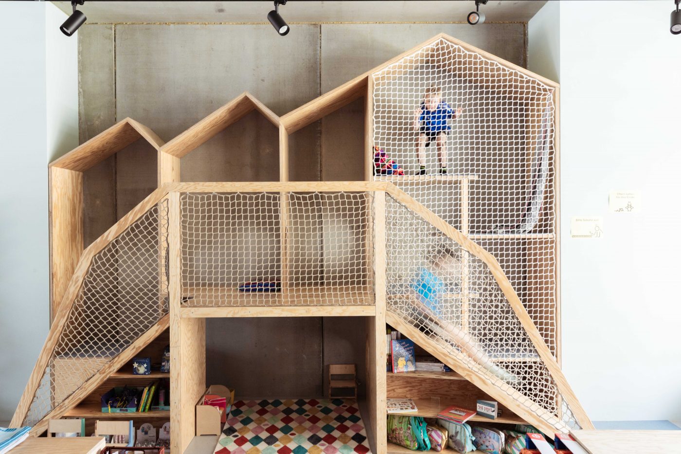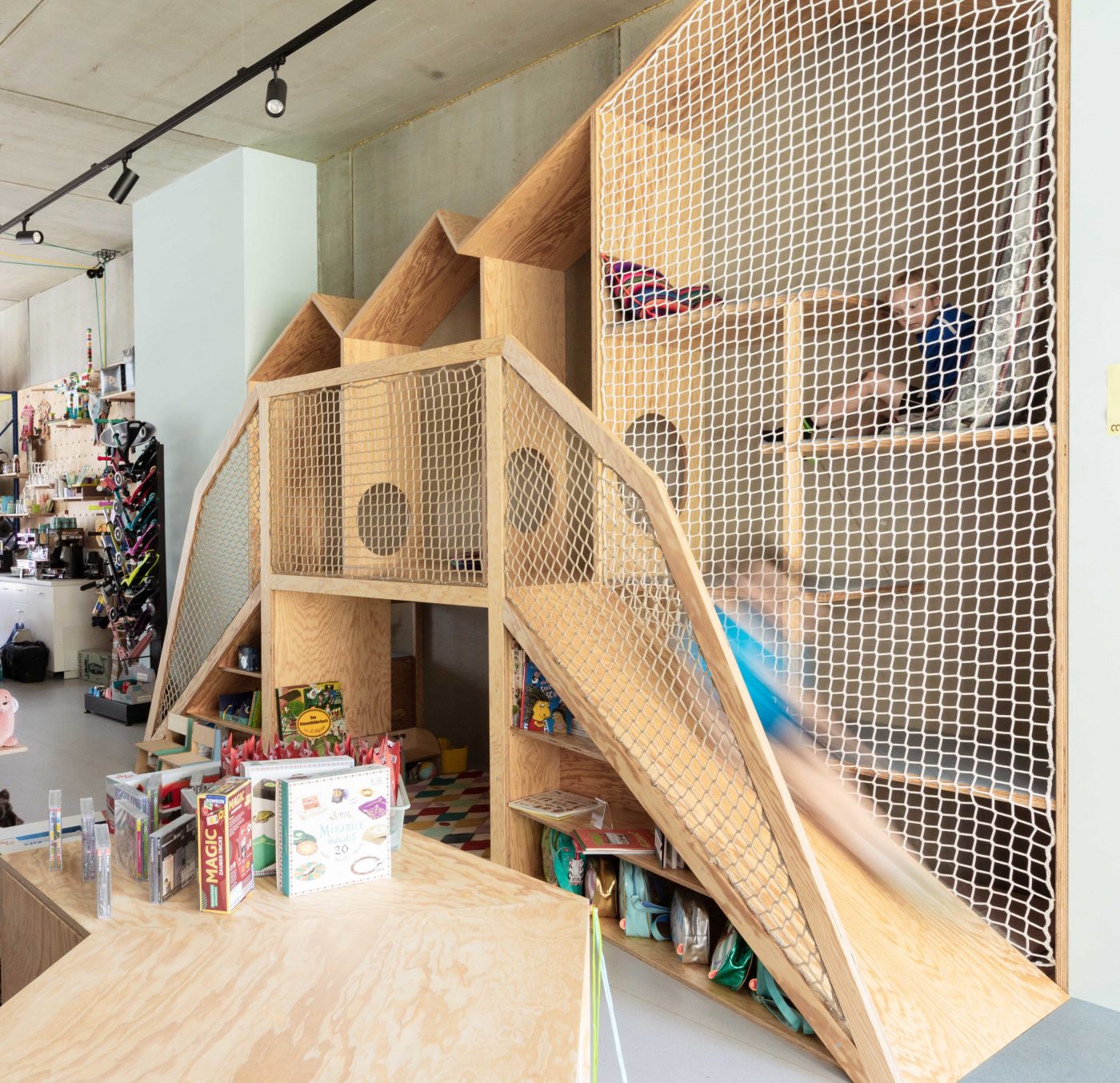 Ein Spielturm, vielmehr ganzes Spielhaus, welches die Verweildauer im Geschäft nahezu erzwingt. Die Kinder tollen herum in einer einzigartigen Spielelandschaft, während die Eltern sich in Ruhe beraten lassen können und auch kaufen.