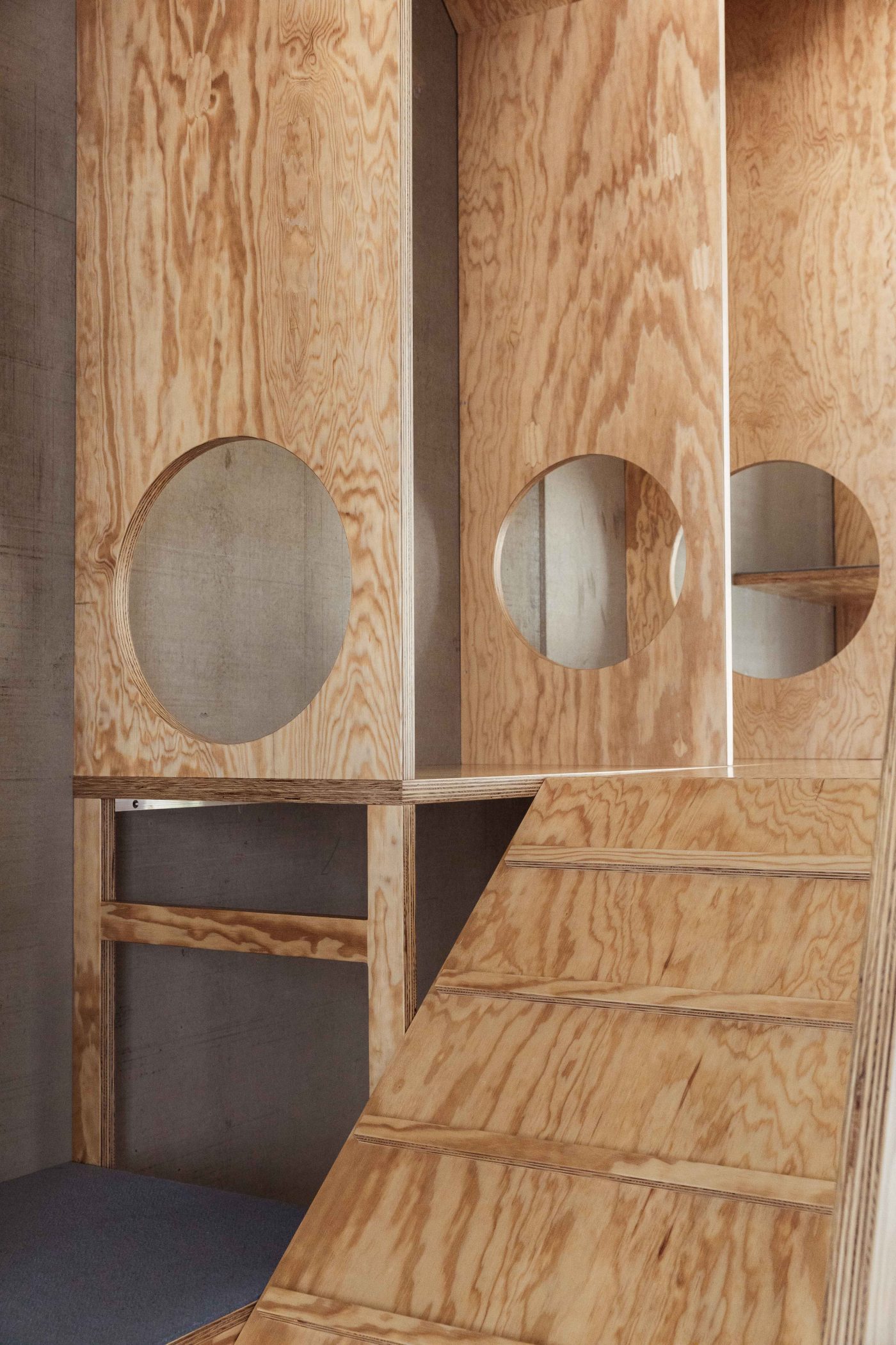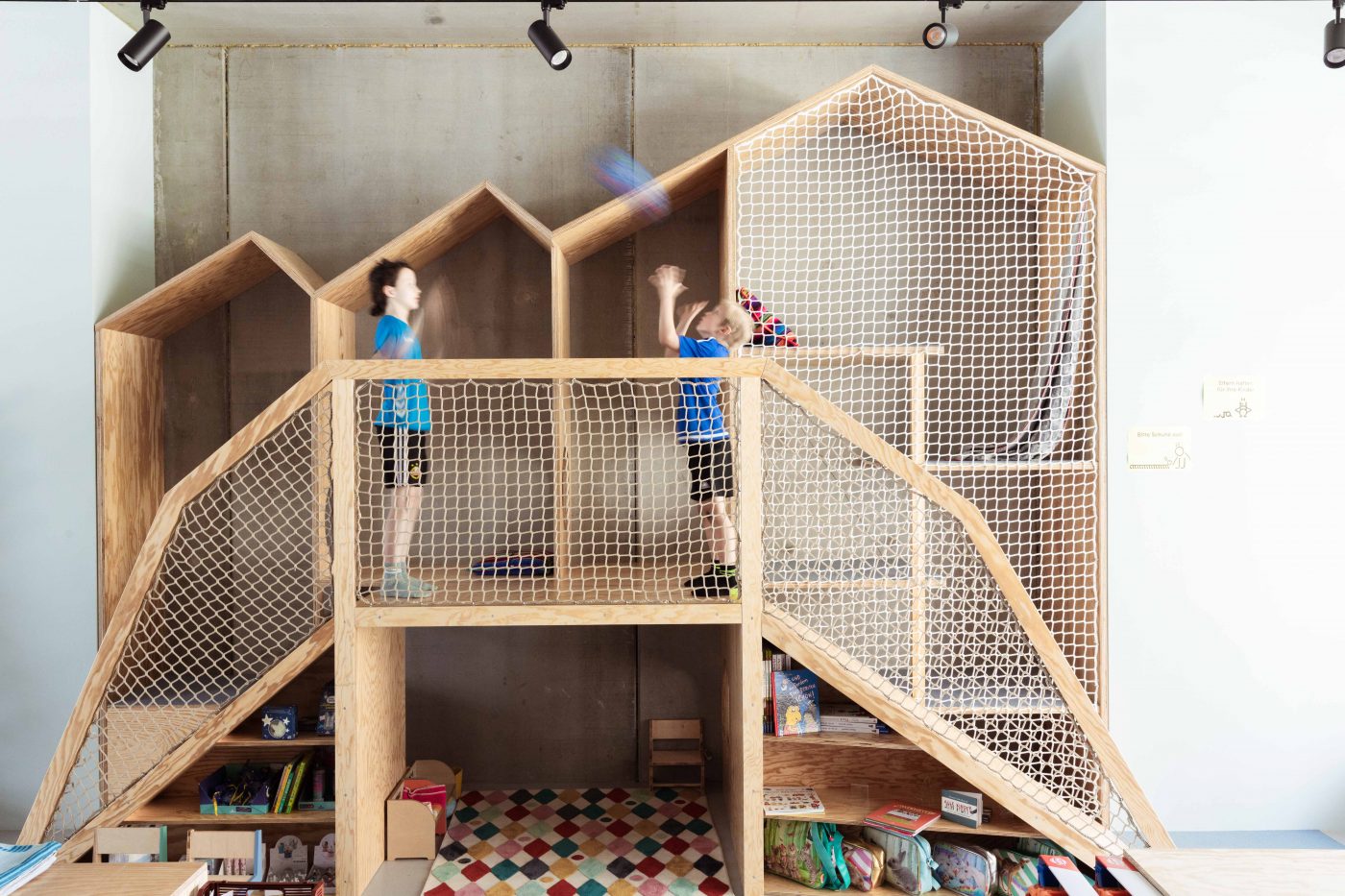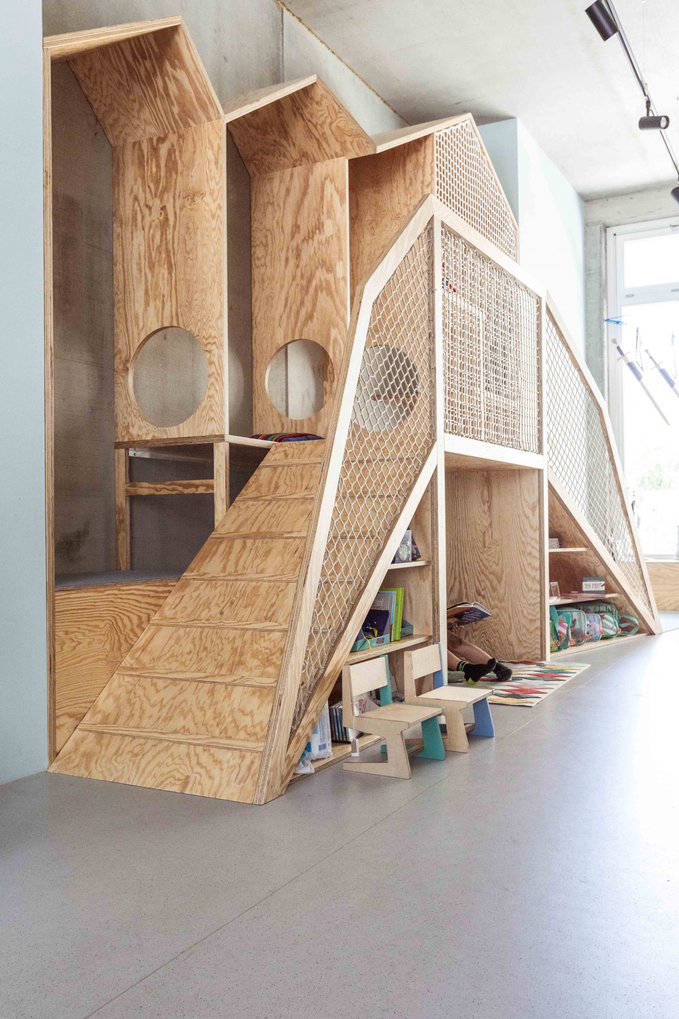 Das ganze Arrangement ist aus Seekiefer hergestellt und farblos lackiert. Heimelige Nischen mit Büchern laden zum Lesen ein. Aus dem „Dachgeschoß“ haben die Kid’s einen tollen Überblick ins Geschäft. Netze aus Stricken sichern gegen Sturzgefahr.