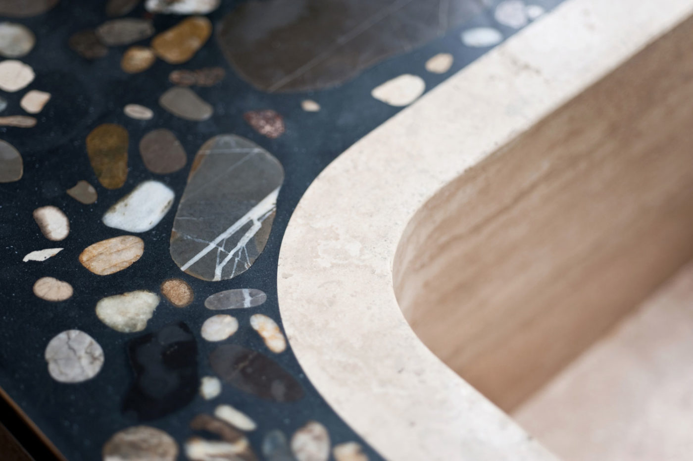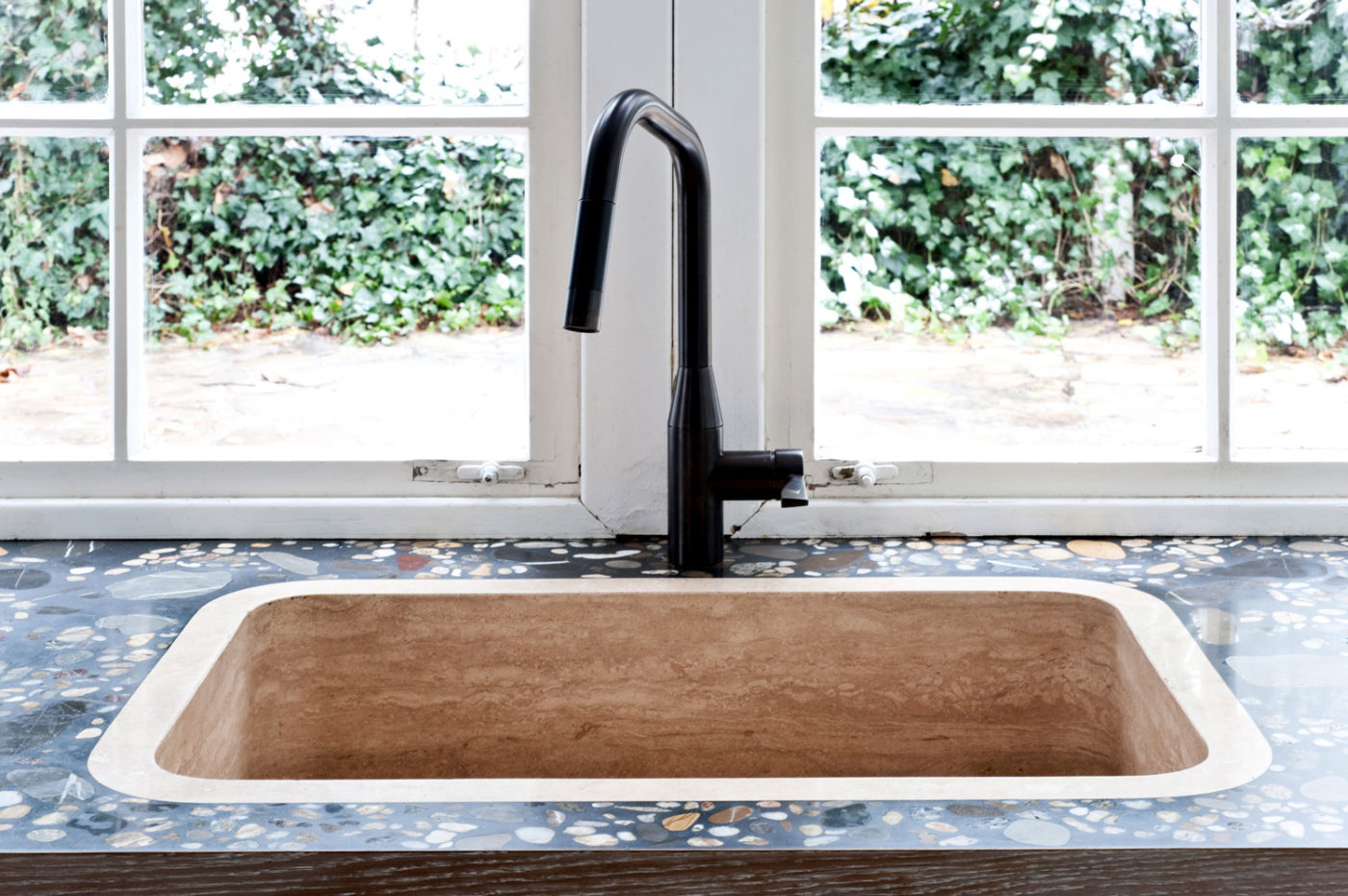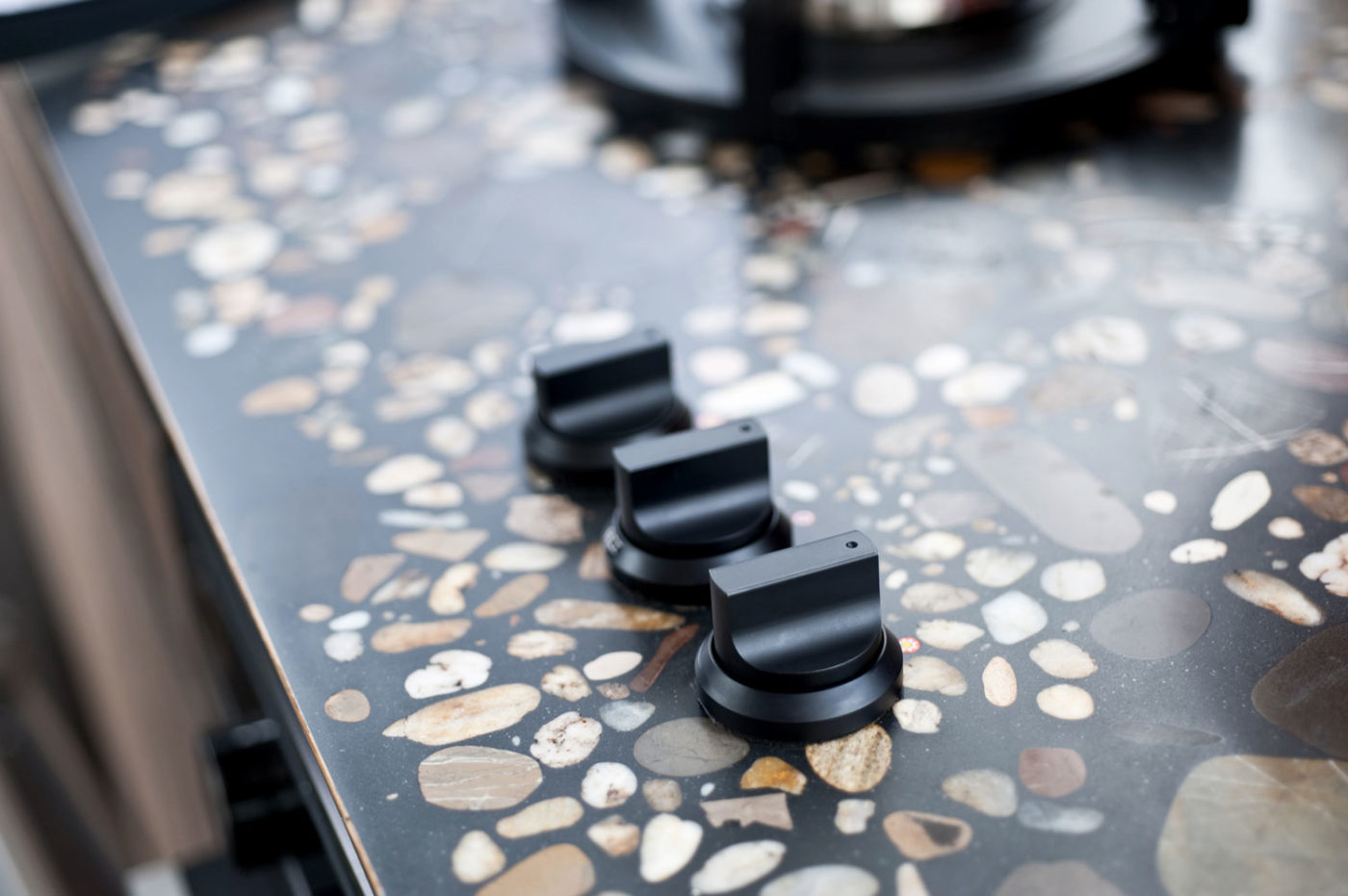 Weiche Haptik an den gerundeten Laden und eigens angefertigte Terrazzo-Arbeitsplatten, dazu ein Spülbecken aus Naturstein bilden Kontraste und dennoch Harmonie. Im Terrazzo integrierte Gas-Kochstellen wirken ein wenig retro, sind aber hightech für direkteres Kocherlebnis.