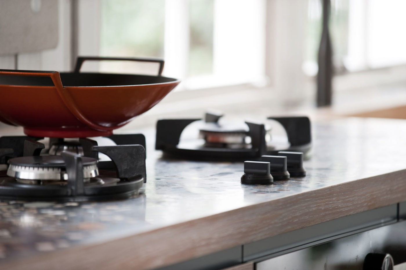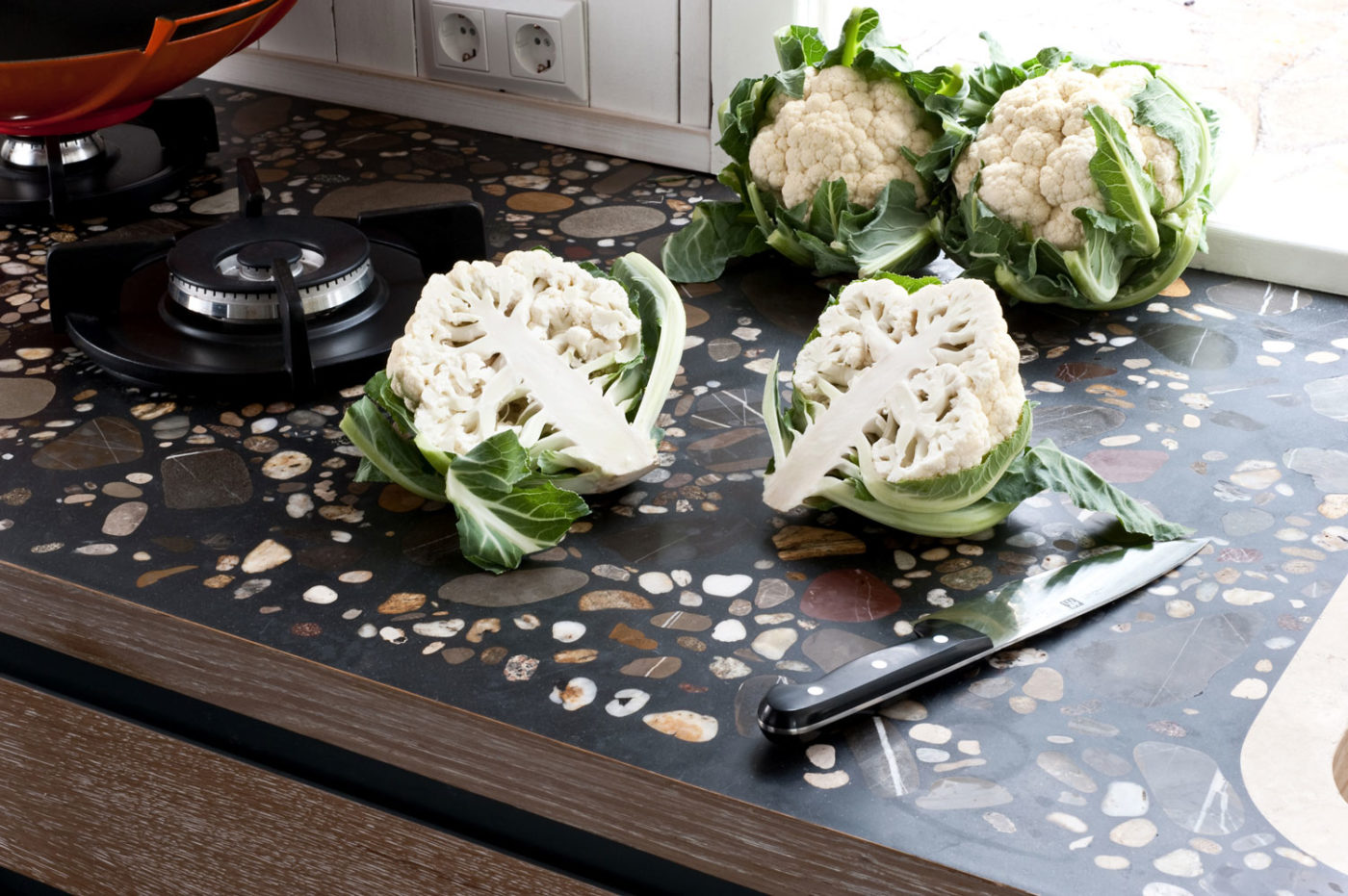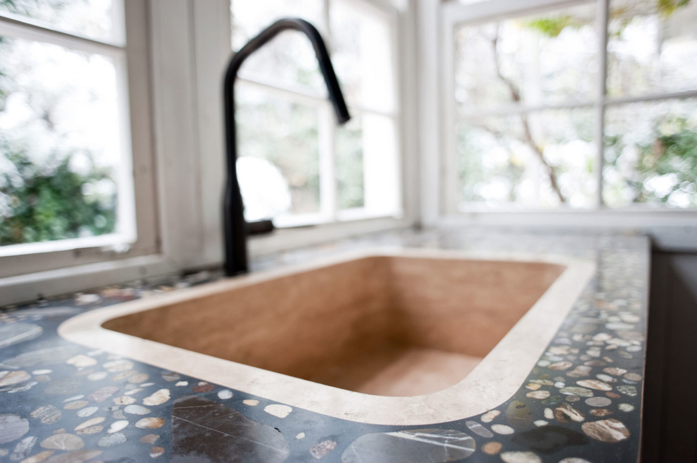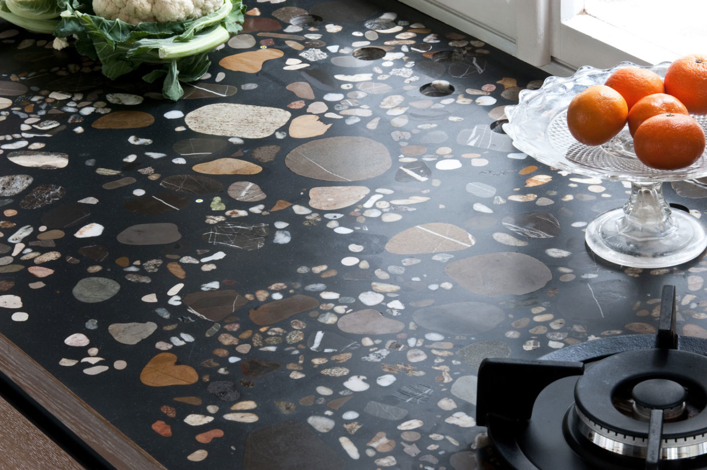 Weiche Haptik an den gerundeten Laden und eigens angefertigte Terrazzo-Arbeitsplatten, dazu ein Spülbecken aus Naturstein bilden Kontraste und dennoch Harmonie. Im Terrazzo integrierte Gas-Kochstellen wirken ein wenig retro, sind aber hightech für direkteres Kocherlebnis.